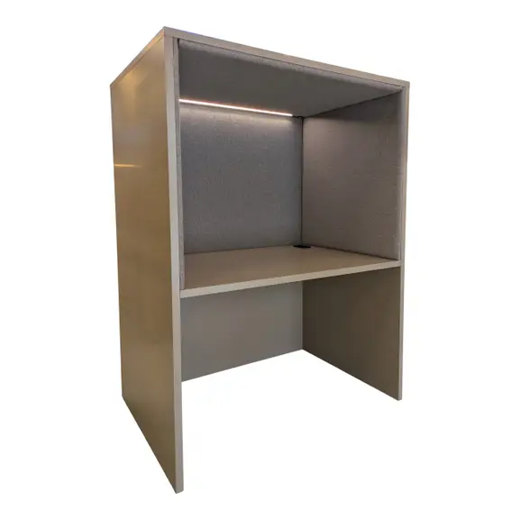 Ljudisolerat arbetsbås utrustad med ett integrerat bord och belysning skapar den en arbetsplats för arbete i lugn och ro. Med belysning och eluttag. LED-list med tre olika ljusstyrkor.