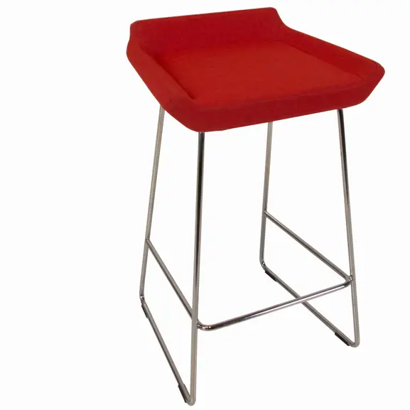 Happy Barstool är den moderna barstolen med långa, smala ben och låg rygg. Här presenterad med ett oranget tyg. Underrede i krom. Sitthöjd: 65 cm