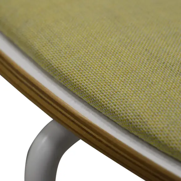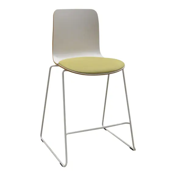 Med hög finish och genomtänkta former kan Sola barstol enkelt integreras i olika typer av miljöer. Vit rygg med sits klädd i grönt tyg.