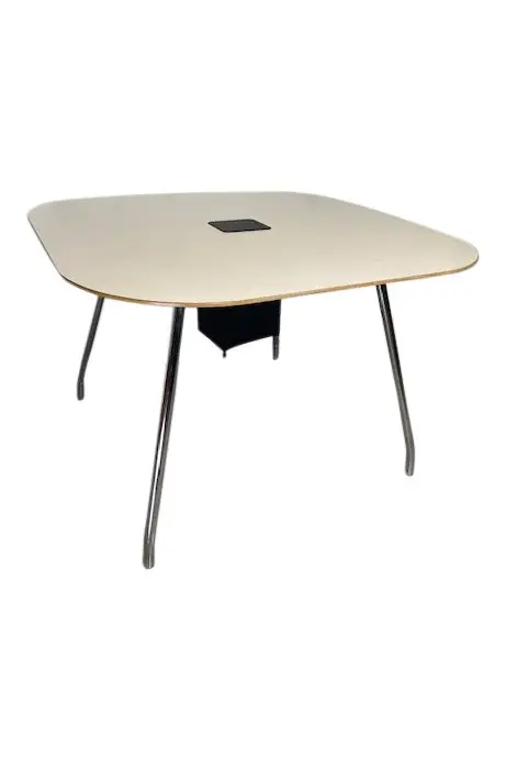 Bord ”Cornflake” från Offecct. Slipp synliga kablar med detta bord som är utrustat med kabellucka och eluttag, där en rejäl tygpåse under bordet förvarar kablarna. Vit bordsskiva med synlig kant i trä och kromade ben.