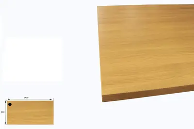 Bordsskiva i ek. Gjord för skrivbords ändamål med robust och lättstädad laminat. Kompletteras med ben, stativ eller elstativ. Förborrat hål på vänster sida för kabelgenomföring.