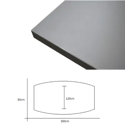 Grå, tvådelad, båtformad bordsskiva ämnad för konferens i laminat. Kompletteras med passande stativ.