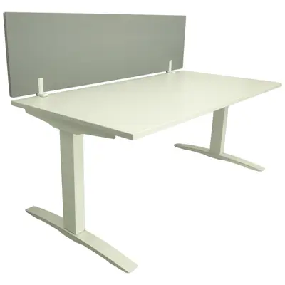Vitt höj- och sänkbart skrivbord med ljusgrå bordsskärm från Haworth. Kabeldike. Justerbar höjd: 65-125cm. Bordsskärmen bygger 43cm över skrivbordsytan.