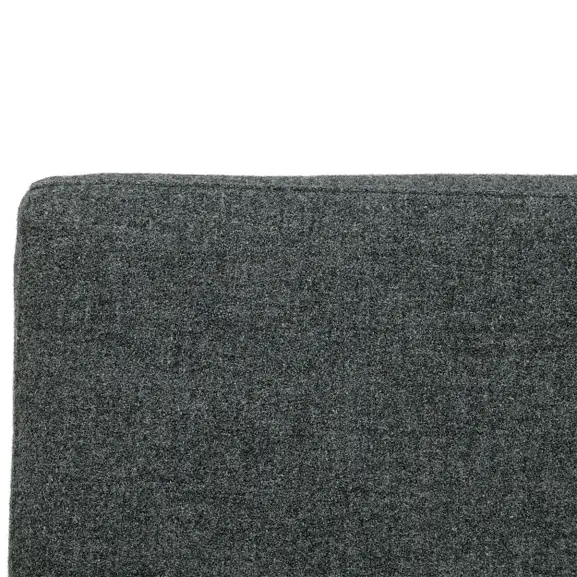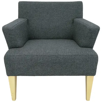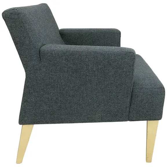Trevlig fåtölj med lite annorlunda form från Kinnarps. Klädd i ett mörkgrått tyg på fötter i björk. Sitthöjd: 45cm.