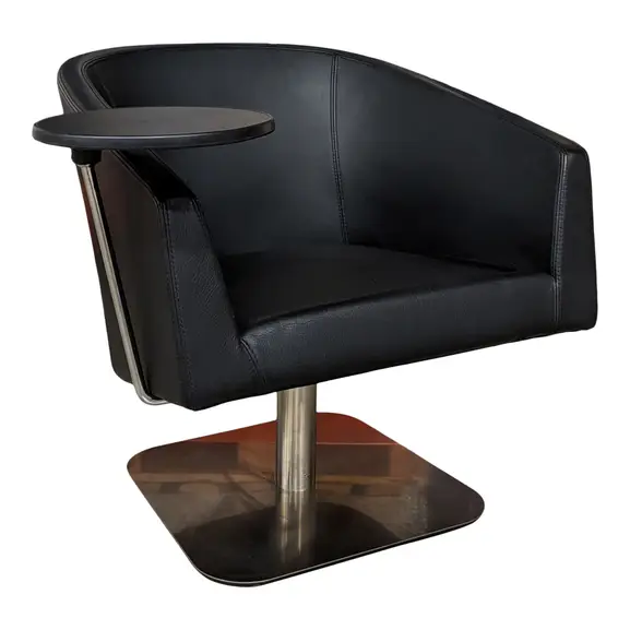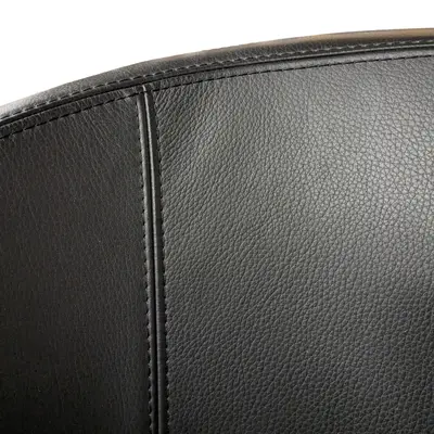 Fåtöljen Club från Lammhults, helklädd i svart konstläder och underrede i krom. Sätet och ryggen, med en inre stålram, är i gjuten polyuretan, med olika skumdensiteter i sätet och baksidan. Modellen har ett ledat bord som är lätt att vinkla in/ut och är formgiven av Johannes Foersom och Peter Hiort-Lorenzen.