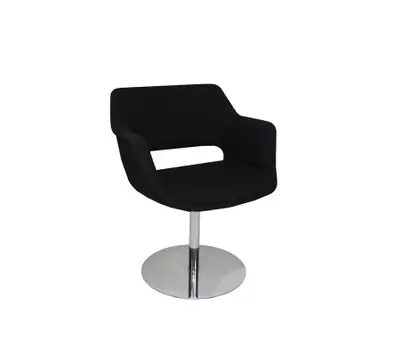 Fåtöljen Kilta från Martela i svart utförande. Pelarfot i krom. Fungerar lika bra som konferenssstol. Olli Mannermaas Kilta-stol blev ett samlarobjekt redan när den kom 1955. Om än ständigt aktuell har Kilta blivit ännu mer populär i takt med att trenden går mot mer ombonade och hemlika kontor.