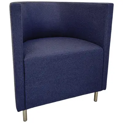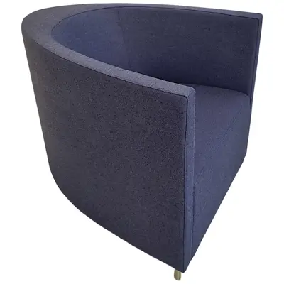 Ellips från Miljöexpo är en bekväm fåtölj med hög komfort och snygg design som gör sig extra väl i rum där den kan ses från olika vinklar. Klädd i ett mörkblått tyg. Sitthöjd: 44cm.