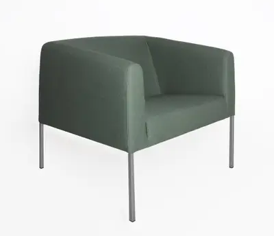 Fåtöljen Boxer från Skandiform i mörkgrönt. Underrede i krom. Boxer har fått sitt namn av likheten med hundrasen Boxer. Sedd från sidan har den samma spänst i sin profil. Sitthöjd: 39cm.