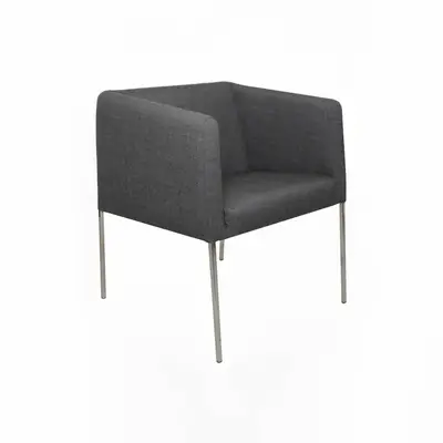 Fåtöljen Boxer från Skandiform, helklädd i ett mörkgrått tyg och underrede i krom. Boxer har fått sitt namn av likheten med hundrasen Boxer. Sedd från sidan har den samma spänst i sin profil. Sitthöjd: 45cm.