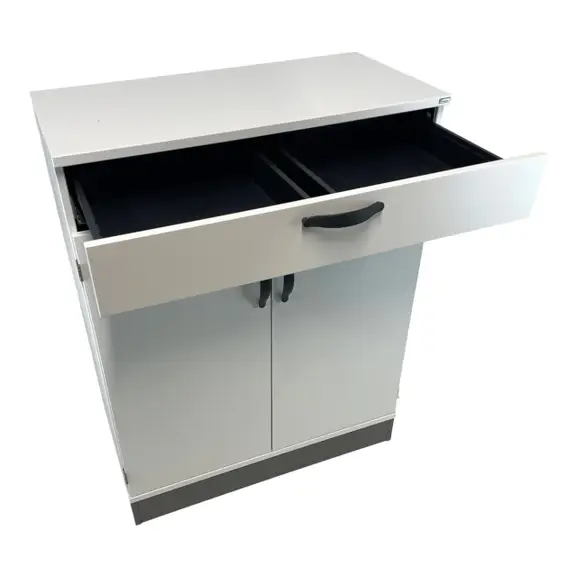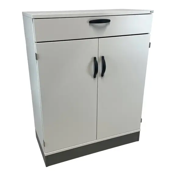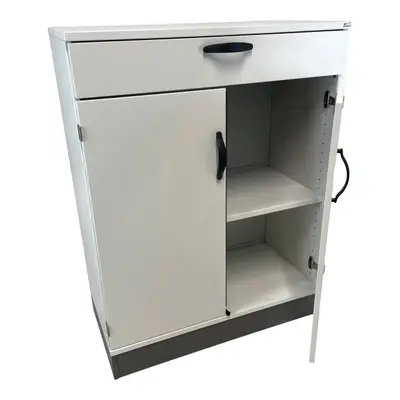 Förvaring med luckor och utdragslåda från kvalitetssäkra Kinnarps. Skåpet är vitt med grå sockel och svarta handtag.