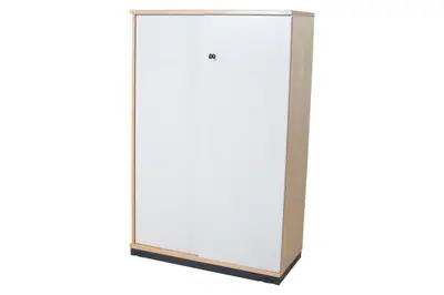 Skjutdörrsförvaring från Kinnarps i björk med vita dörrar. 3XA4 och låsbar.