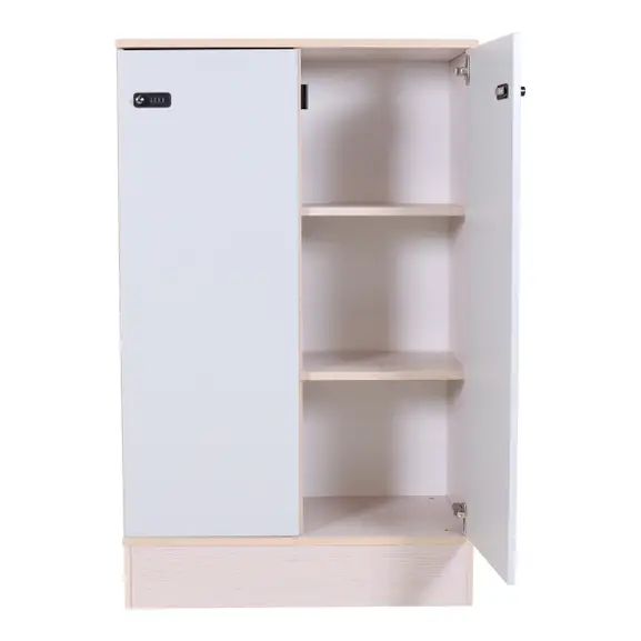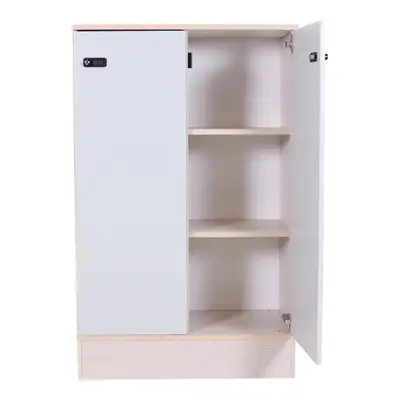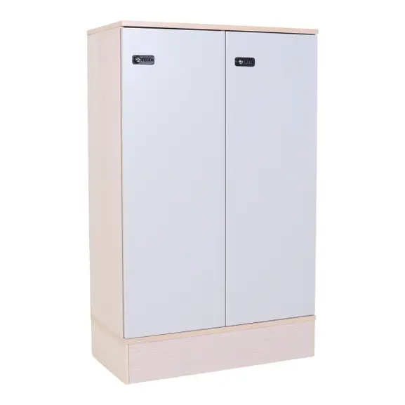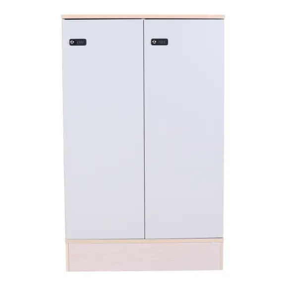 Förvaring från Kinnarps med grå dörrar på askstomme. Kodlås på varje dörr.