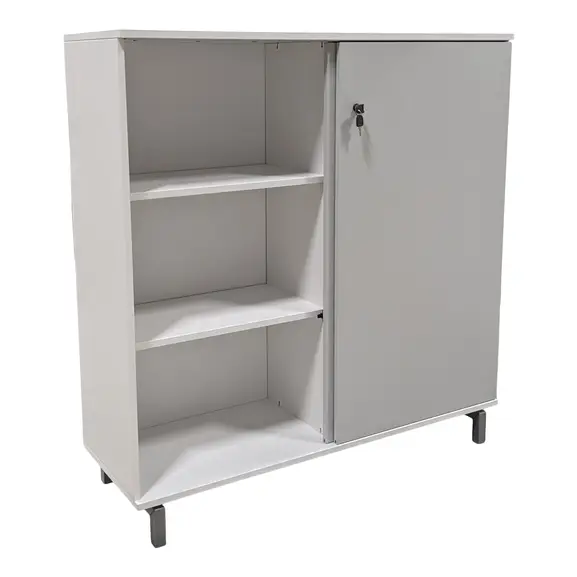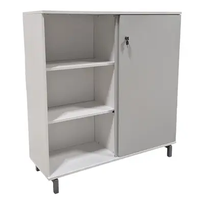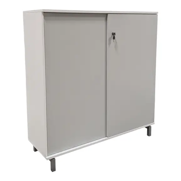 Stilren vit förvaring från Kinnarps, med ljusgrå låsbara skjutdörrar.