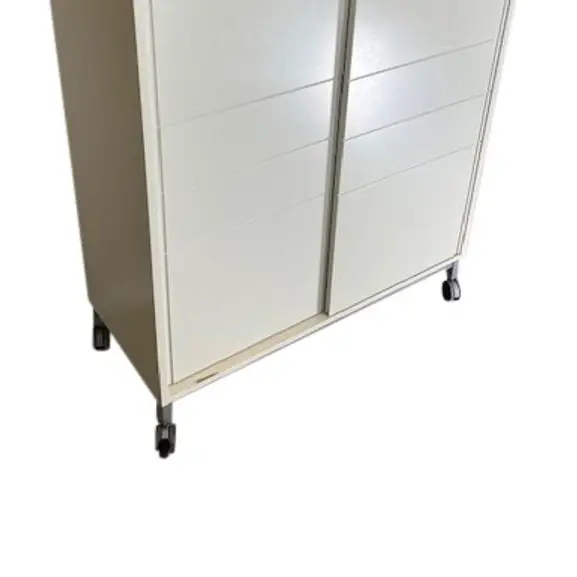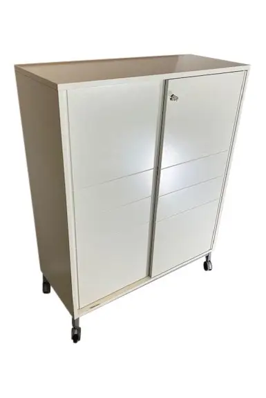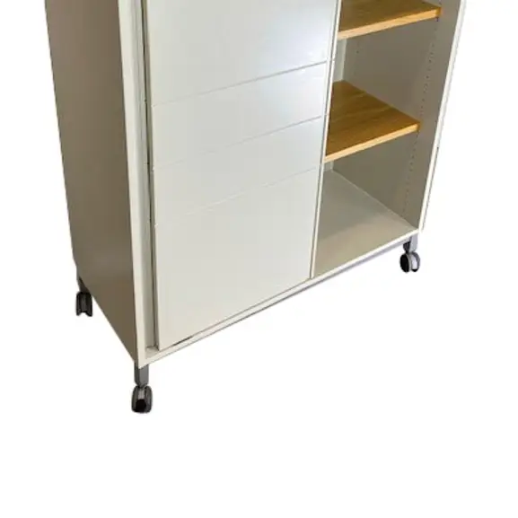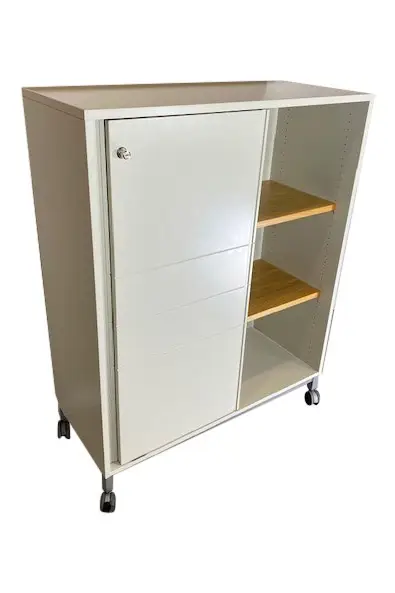 Förvaring på hjul med tillhörande nyckel. Tidigare omlackerad i beige/grå kulör, hyllor samt lådinstans i trä.