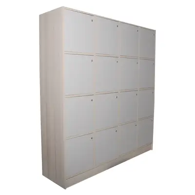 Helt nytt 16-facksskåp med stomme i ask och dörrar i vitt. Varje fack är låsbart och nycklar ingår till varje fack.