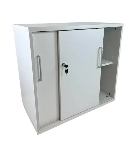 Platsbesparande skåp med skjutdörrar. Baksidan är av laminat. Skåpen kommer med justerbara tassar vilka är enkla att reglera.