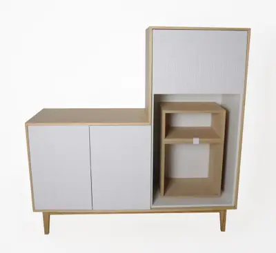 Snygg förvaring med lite annorlunda utformning. Förvaringen har tre stycken stängbara skåp, två på den kortare delen av förvaringen och en längst upp på den högre delen av förvaringen. Två stycken öppna hyllor följer med som hålls tillsammans med två vita clips från Muuto.