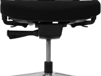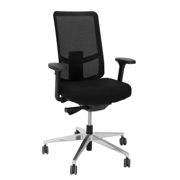 Arbetsstolen har enkel viktkänslig synkroniserad gunga med tre låsningslägen på ryggstöd, sitsbredd 48,5cm och polerat aluminium fotkryss.