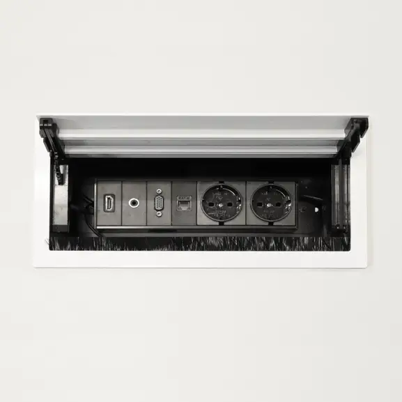 Centrerat på skivan finns det ett kabellock och undertill finns en kabelbrunn som smidigt samlar upp alla sladdar.
