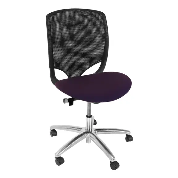 Arbetsstol med lila sits och svart mesh-rygg och kromat underrede.