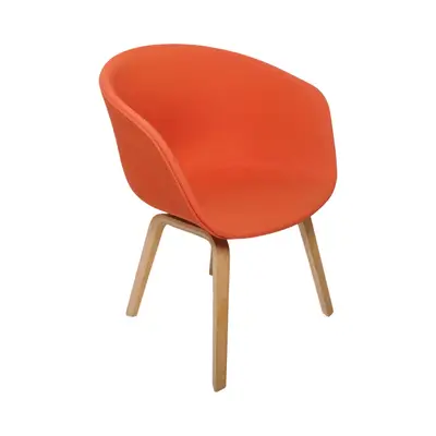 Den låga stolen About a Chair AAC43 från danska HAY. Med sin iögonfallande enkelhet gör About a Chair AAC43 sig lika väl runt matbordet som konferensbordet. Helklädd i ett orange tyg och underrede i lackad ek. Sitthöjd: 38 cm.