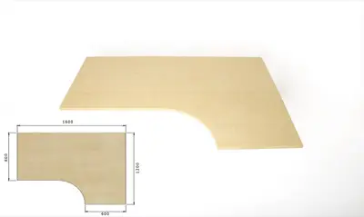 Högersvängd skrivbordsskiva i björklaminat. Denna modell kallas kombiskiva och är svängd för att kunna ge mer arbetsyta. Kompletteras med passande underrede.