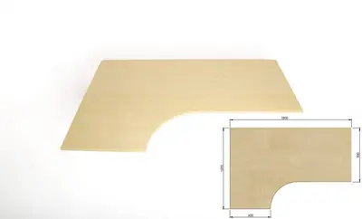 Vänstersvängd skrivbordsskiva i björklaminat. Denna modell kallas kombiskiva och är svängd för att kunna ge mer arbetsyta. Kompletteras med passande underrede.