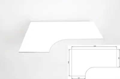 Skrivbordsskiva i vitt laminat. Denna modell kallas kombiskiva och är svängd för att kunna ge mer arbetsyta. Bilden visar en vänstersvängd skiva, men givetvis kan svängen likaväl ligga åt höger. Kompletteras med passande underrede.