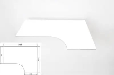 Högersvängd skrivbordsskiva i vitt laminat. Denna modell kallas kombiskiva och är svängd för att kunna ge mer arbetsyta. Kompletteras med passande underrede.