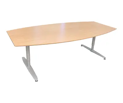 Snyggt och stabilt konferensbord. Konferensskivan är i björk med form av en eka och underredet är från Kinnarps i grå färg. Underredet är justerbart.