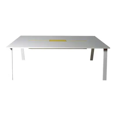 Piece är ett robust och snyggt konferensbord från Edsbyn, helvitt med gul kabellucka.