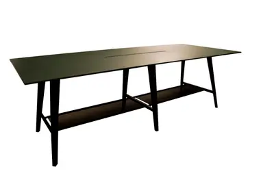 Konferensbordet E5 Work Meeting är en serie mötesbord som passar för att arbeta med projekt i en grupp samt individuellt arbete. Den har funktioner som gör att du känner dig hemma men samtidigt i ett kreativt tillstånd. E5 Work Meeting-seriens mest uppenbara designfunktion är formen och vinkeln på benet. Valet av material bidrar till en varm och inbjudande känsla av att vara hemma eller i en mysig lounge. Konferensbordet är tvådelat med ett längre, centrerat kabellock med tillhörande kabelränna undertill för smidig hantering av arbetsplatsens sladdar. Konferensbordet har även ett fotstöd längst med hela bordet, som också kan användas till att placera väskor på.