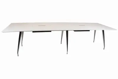 Bord med skiva i vitlaminat. Ben i polerad aluminium. Designer: Ruud Ekstrand ”COLT; ett ben, sargar i varierande längd. Rektangel, kvadrat och cirkel. THE ABLE TABLE.”