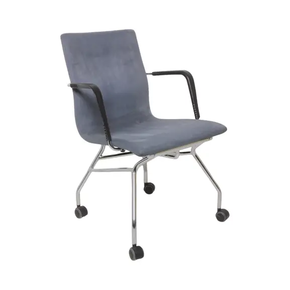 Smart konferensstol som går att trava många tillsammans på bredden genom en unik konstruktion av underredet. Hjulförsedda stol helklädd i ett blått alcantara-tyg. Sitthöjd: 45cm.
