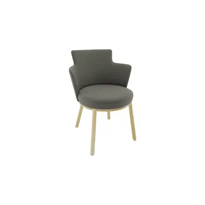 Karmstolen Zen Conference HR III från Gärsnäs är en stol med förhöjd rygg, helklädd i ett grått tyg. Underrede i ask. Sitthöjd: 46cm.