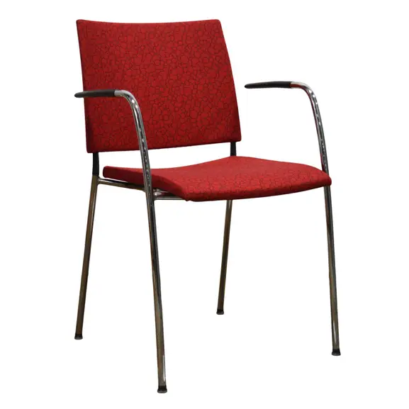 Den snygga och bekväma stolen Spira från Lammhults, helklädd i rött mönstrat tyg med kromat underrede. Stolen är stapelbar. Ställbara fotpluggar.