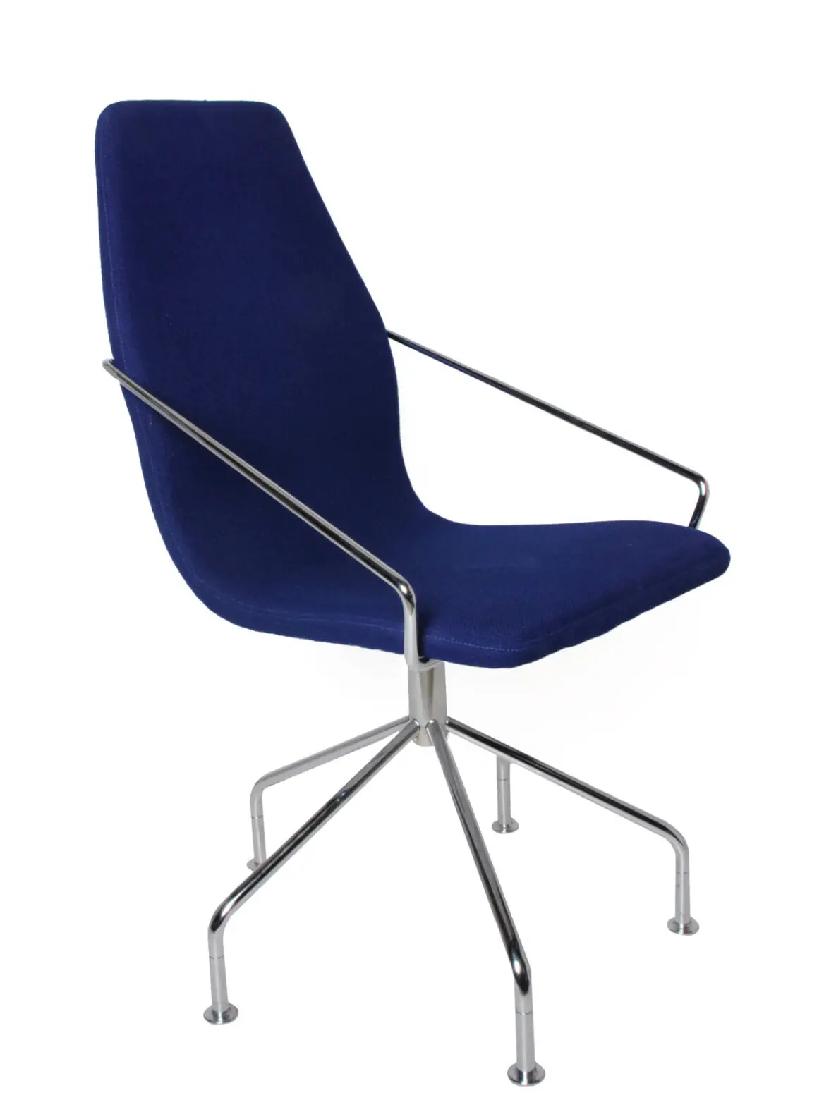 Konferensstolen Aeon KS-181 från Skandiform. Stolen är helklädd i ett mörkblått tyg och har ett vridbart underrede på glidfot i krom. Sitthöjd: 46cm.