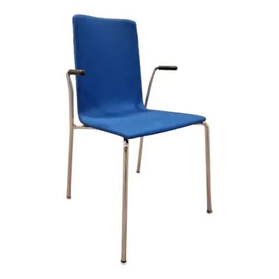 Stapel- och upphängningsbar karmstol från Skandiform. Helklädd i ett blått tyg med kromat underrede.