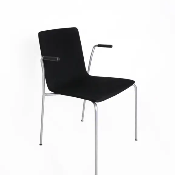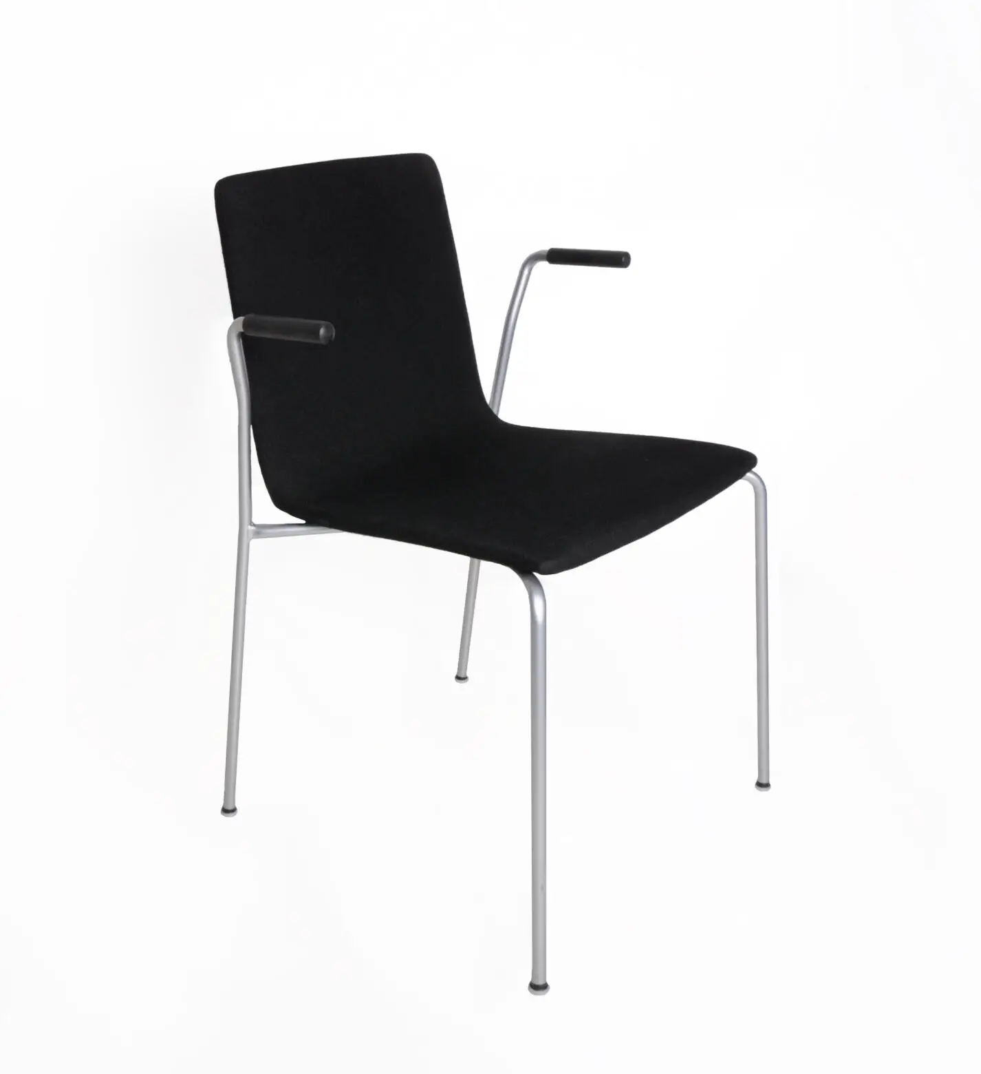 Stapel- och upphängningsbar karmstol från Skandiform. Helklädd i ett svart tyg med grått underrede. Sitthöjd: 45cm.