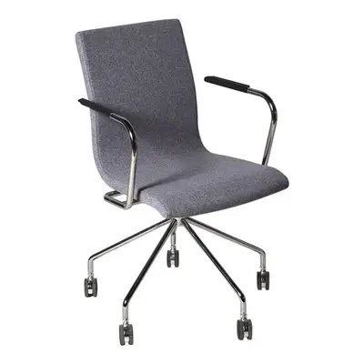 Designer: Ruud Ekstrand ”Nyckelordet är flexibel. Stol, karmstol, snurrbart underrede: fyrvingat eller femvingat med hjul. Skön svikt i ryggen.” Vridbart underrede på hjul i krom. Armstöd i svart TPE.