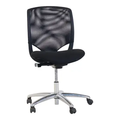 Arbetsstol i svart mesh-tyg, svart nyklädd tyg och kromat underrede.