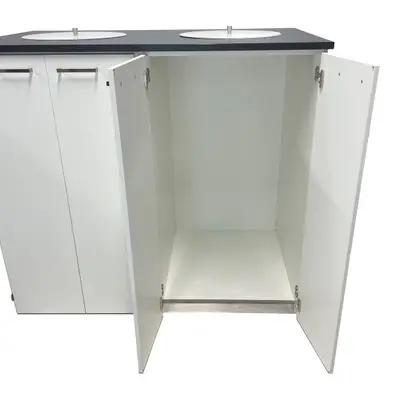 Miljösortering från TreCe speciellt designade för källsortering på kontor. Topskivan har två runda håltagningar med tillhörande lock i vitt pulverlackerat stål. Bakom skåpsluckorna finns plats för returkärl på hjul (ingår ej). Bottenplattorna i skåpet är försedda med uppkörningsramp i rostfri plåt för enkel in/utkörning av returkärlet.