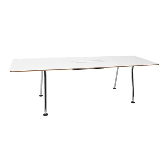 Snyggt och stabilt mötesbord från Skandiform. Konferensskivan är vit med fasad kant. Underrede i krom.