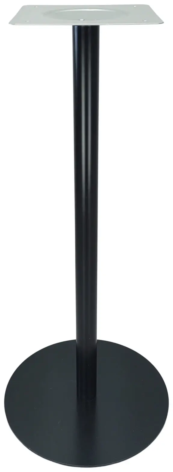 110 cm högt pelarstativ i metall med rund botten Ø50cm, övre platta 30x30cm. Passar bordsskiva ca Ø60-90cm.