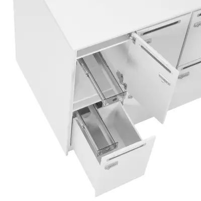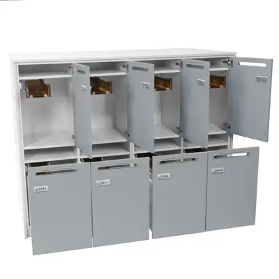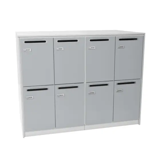 Personalskåps Ö 16-dörrar från Martela med kodlås. Varje sektion består av 2st övre skåp och 2st undre utdragskåp med postfack övertill i vardera skåp. Inuti finns även ett mindre utdragsfack för enkel förvaring av mindre föremål.