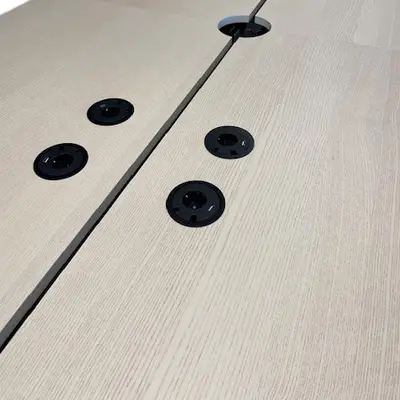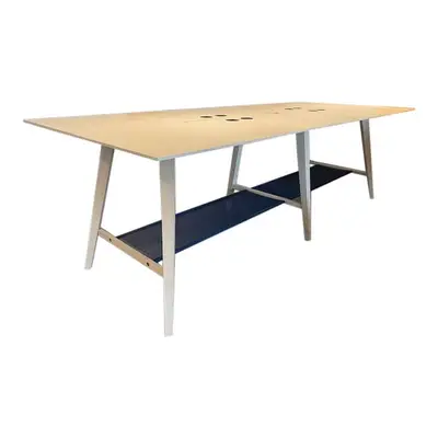 Stort projektbord i ask med fotstöd/förvaring i blå stäckplåt. 8st powerdots samt en kabellucka i mitten av bordet.