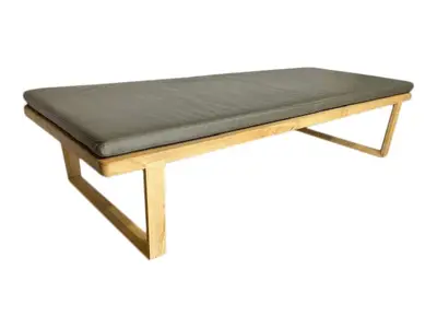Sittbänk i massiv ek med tillhörande dyna. Materialet på dynan är grönt skinn. Sitthöjden med dynan blir 41cm.