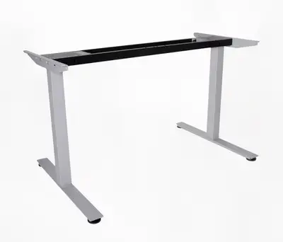 Helt nytt tvåbensstativ med rektangulär design i grått. Avsaknaden av mellanstag ger gott om utrymme för användarens ben, utan att förlora stabiliteten. Eftersom stativets balkar är flexibla passar skrivbordet bordsskivor mellan 120-200cm. Justerbar höjd: 68-117cm. OBS! Bordsskiva köpes separat.