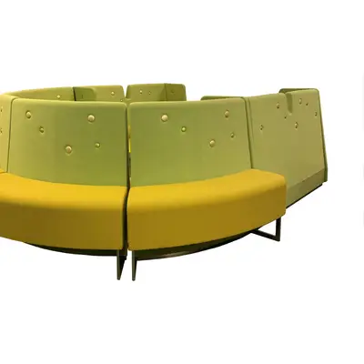 Le Mur fungerar som ett rum i rummet. De höga stoppade ryggarna ger naturlig avskärmning och ljuddämpning. Knapparna i ryggen på Le Mur är inte bara en dekoration. Eftersom de är genomgående kan de på baksidan fungera både som klädhängare eller upphängningsanordning för tidningsställ. Soffan rygg och sidor är klädd i ett ljusgrönt tyg, medan sits och ryggstöd är i en gul tygklädsel. På soffans rygg löper det också en bänk som är integrerad i soffan, också den klädd i gul tygklädsel. Sitthöjd: 45cm.