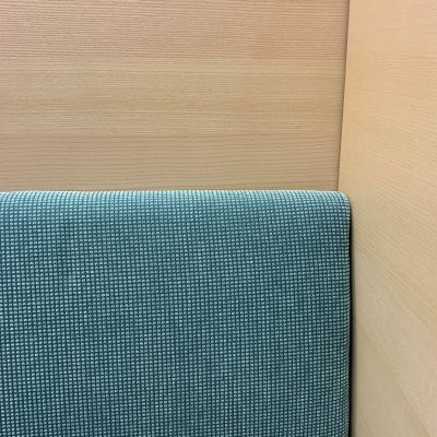 Telefonsoffa från Ragnars, kallad E5 Work 1. Soffan har en stomme i björk och sits och rygg klädd i ett grönt tyg. På soffans underkant finns en powerdot inbyggd med ett eluttag, en usb-ingång samt ett nätverksuttag. Sitthöjd: 46cm.